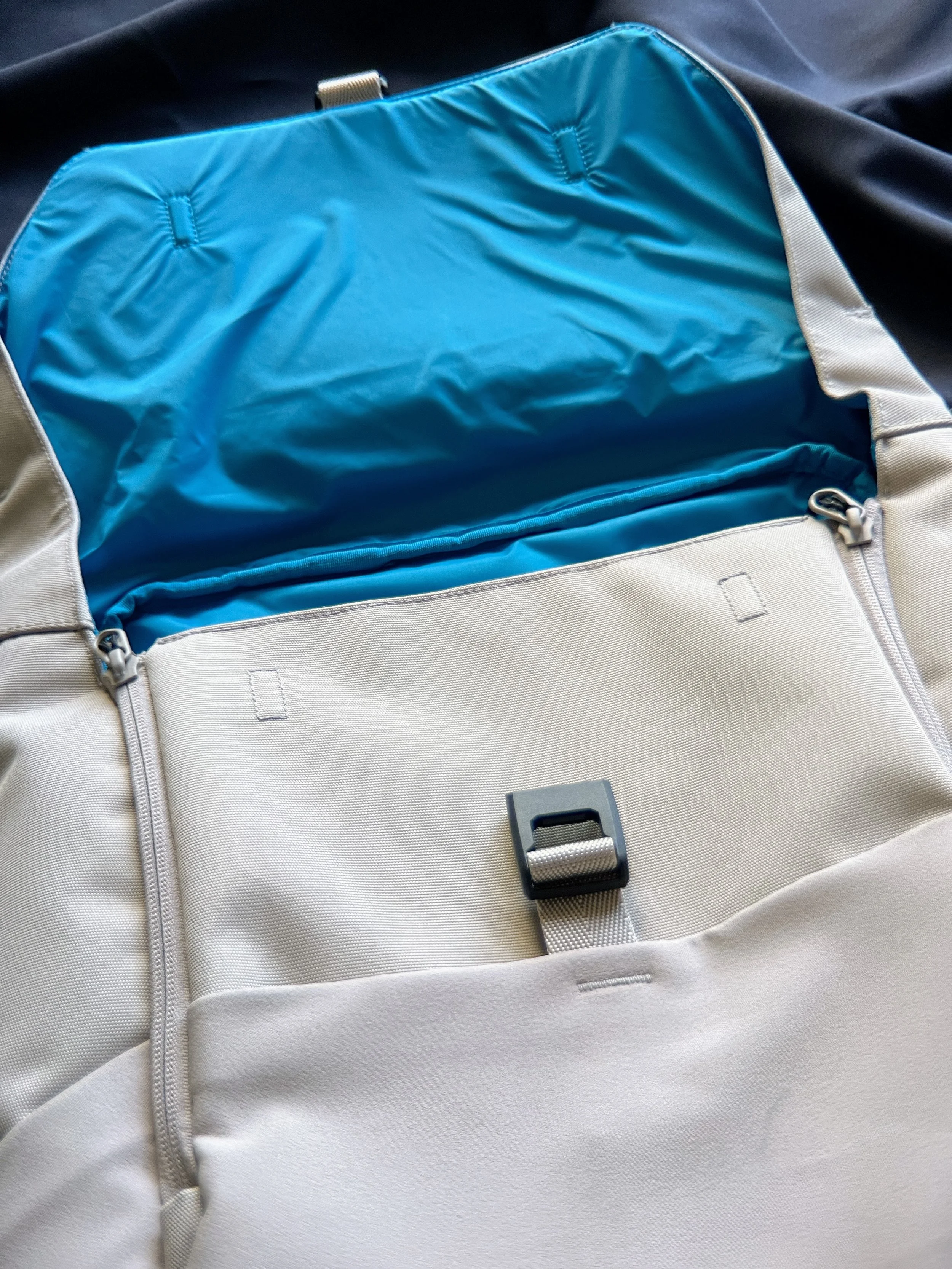 Going inside the bag, you’ll immediately be hit with hi-vis blue. It’s a great detail because, with a bag this size, a brighter interior helps to find those small bits that so easily got lost in the shuffle. I also want to note that there’s an exterior fabric and a completely different inner material, which shows the quality and longevity of this bag. So many bags nowadays have one layer of material that is easy to puncture, abrase, and ruin. But with two layers, you have a durable abrasion-resistant layer coupled with the strength of a water-resistant inner material. This will last a while.